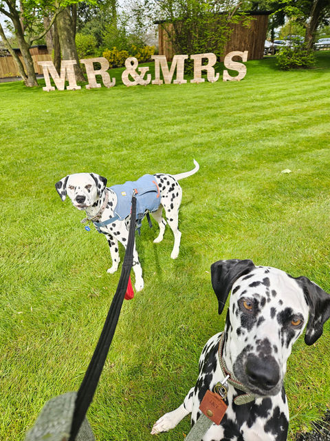 The pleasure was all mine chaperoning these beautiful spotty pair at the wedding of Jess & Tim at Hothorpe Hall in South Leicestershire. Maverick is the handsome Dalmatian lad, a recent rescue, who can find new environments incredibly stimulating. We arrived in plenty of time so that he had time to settle, we played, sniffed, walked and had lots of Primula on hand to help keep him calm when there was a lot going on and when waiting in between photo locations. Pepper is the lovely lady dally and she had a big role as ring bearer. Here are a few of the snaps and images that I took on the day and sent to their mum and dad.